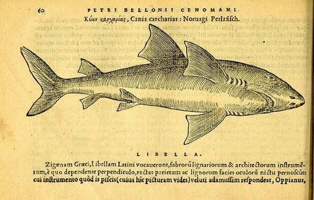 An excerpt from a 1553 book on fish by the French naturalist, Pierre Belon, with this shark given the dog-related denomination ‘canis carcharias’; Photo: Biodiversity Heritage Library